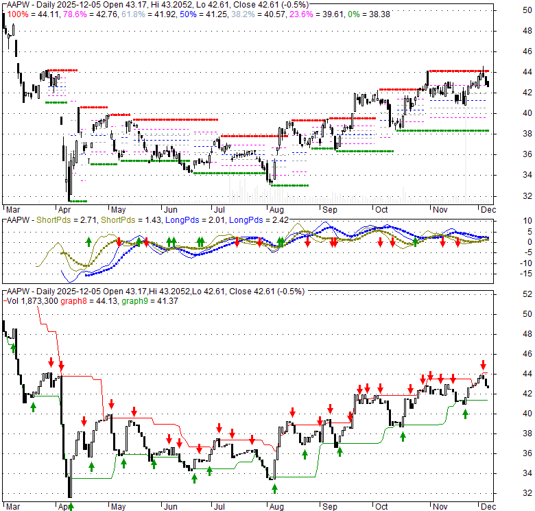 Price has closed below its short-term moving average. Short-term moving average is currently above mid-term; and above long-term moving average. From the relationship between price and moving averages: This stock is NEUTRAL in short-term; and BULLISH in mid-long term.[ AAPW ] has closed below upper band by 44.9%. Bollinger Bands are 9.8% narrower than normal. The current width of the bands does not suggest anything about the future direction or movement of prices.