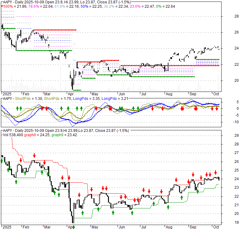 Price has closed below its short-term moving average. Short-term moving average is currently above mid-term; and above long-term moving average. From the relationship between price and moving averages: This stock is NEUTRAL in short-term; and BULLISH in mid-long term.[ AAPY ] has closed above bottom band by 31.6%. Bollinger Bands are 52.8% narrower than normal. The narrow width of the bands suggests low volatility as compared to its normal range. The bands have been in this narrow range for 1 bars. This is a sign that the market may be about to initiate a new trend.