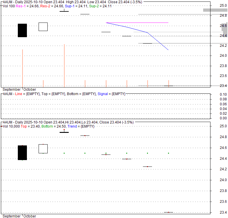 Price has closed below its short-term moving average. Short-term moving average is currently below mid-term; and below long-term moving average. From the relationship between price and moving averages: This stock is NEUTRAL in short-term; and NEUTRAL in mid-long term.[ AAUM ] has closed Bollinger Bands are 0% narrower than normal.
