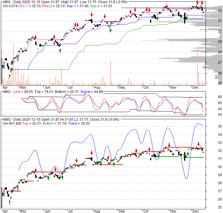 Price has closed below its short-term moving average. Short-term moving average is currently above mid-term; and above long-term moving average. From the relationship between price and moving averages: This stock is NEUTRAL in short-term; and BULLISH in mid-long term.[ ABIG ] has closed below the lower bollinger band by 1.2%. Bollinger Bands are 28% narrower than normal. The current width of the bands does not suggest anything about the future direction or movement of prices.