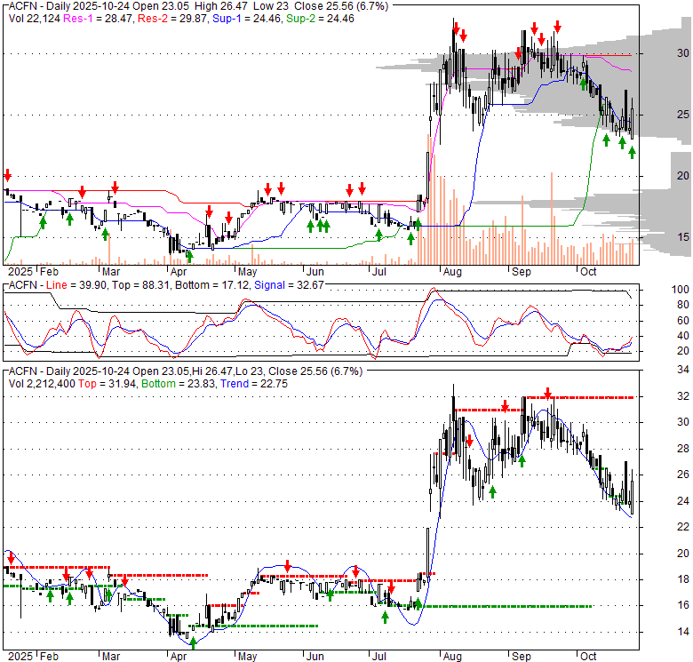 Price has closed above its short-term moving average. Short-term moving average is currently below mid-term; and above long-term moving average. From the relationship between price and moving averages: This stock is NEUTRAL in short-term; and NEUTRAL in mid-long term.[ ACFN ] has closed below upper band by 33.9%. Bollinger Bands are 8.6% narrower than normal. The current width of the bands does not suggest anything about the future direction or movement of prices.