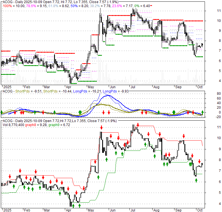Price has closed below its short-term moving average. Short-term moving average is currently below mid-term; and below long-term moving average. From the relationship between price and moving averages: This stock is BEARISH in short-term; and BEARISH in mid-long term.[ ACOG ] has closed above bottom band by 47.8%. Bollinger Bands are 27.9% narrower than normal. The current width of the bands does not suggest anything about the future direction or movement of prices.