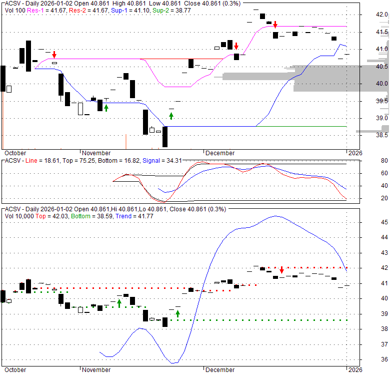 Price has closed below its short-term moving average. Short-term moving average is currently above mid-term; and below long-term moving average. From the relationship between price and moving averages: This stock is NEUTRAL in short-term; and NEUTRAL in mid-long term.[ ACSV ] has closed above bottom band by 5.7%. Bollinger Bands are 0% narrower than normal.