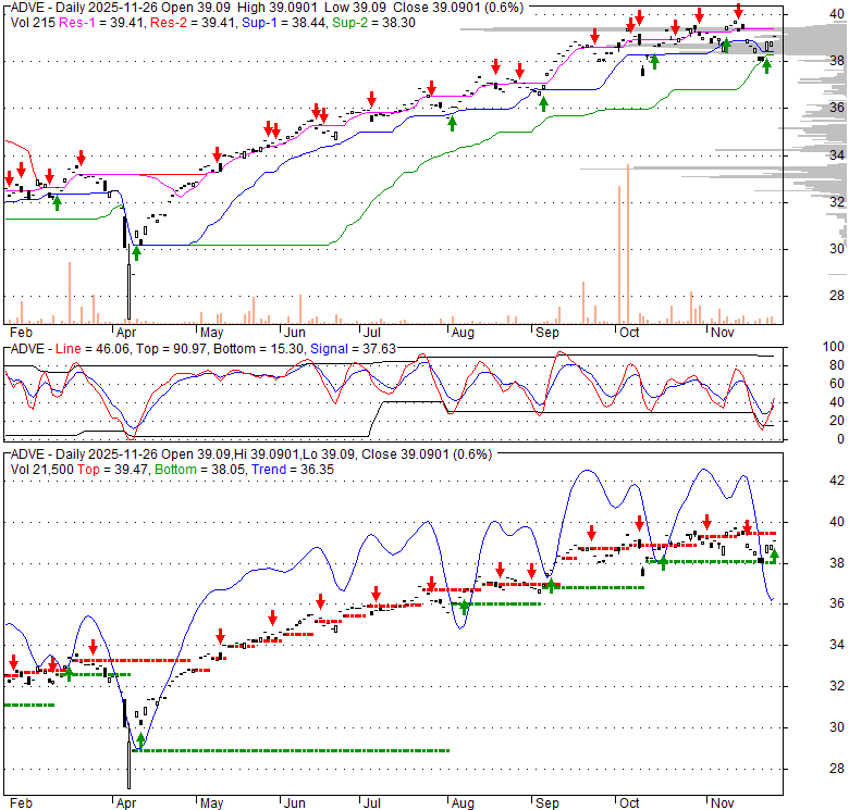 Price has closed above its short-term moving average. Short-term moving average is currently below mid-term; and above long-term moving average. From the relationship between price and moving averages: This stock is NEUTRAL in short-term; and NEUTRAL in mid-long term.[ ADVE ] has closed below upper band by 43.5%. Bollinger Bands are 30.2% wider than normal. The current width of the bands does not suggest anything about the future direction or movement of prices.