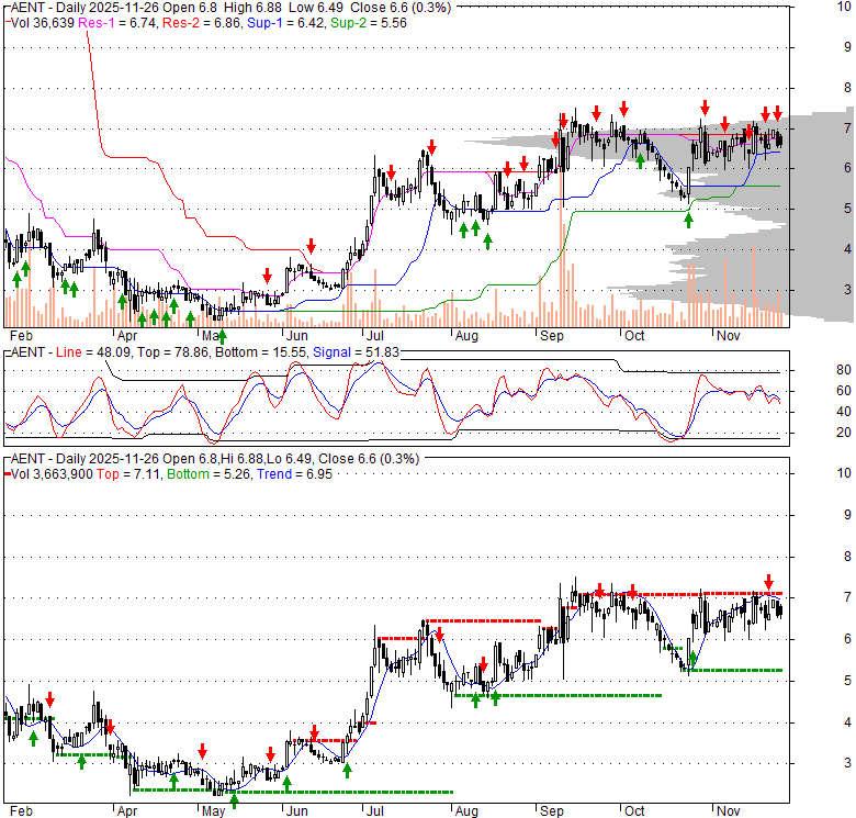 Price has closed below its short-term moving average. Short-term moving average is currently above mid-term; and above long-term moving average. From the relationship between price and moving averages: This stock is NEUTRAL in short-term; and BULLISH in mid-long term.[ AENT ] has closed above bottom band by 41.9%. Bollinger Bands are 52.9% narrower than normal. The narrow width of the bands suggests low volatility as compared to its normal range. The bands have been in this narrow range for 9 bars. This is a sign that the market may be about to initiate a new trend.