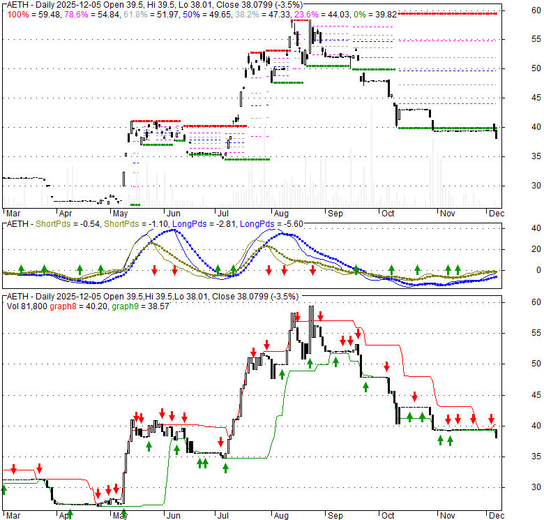 Price has closed below its short-term moving average. Short-term moving average is currently below mid-term; and below long-term moving average. From the relationship between price and moving averages: This stock is BEARISH in short-term; and BEARISH in mid-long term.[ AETH ] has closed below the lower bollinger band by 43.2%. If price is in a downtrend band; this downward trend might continue. However a short term pullback inside the band is likely. Bollinger Bands are 83.8% narrower than normal. The narrow width of the bands suggests low volatility as compared to its normal range. The bands have been in this narrow range for 13 bars. This is a sign that the market may be about to initiate a new trend.