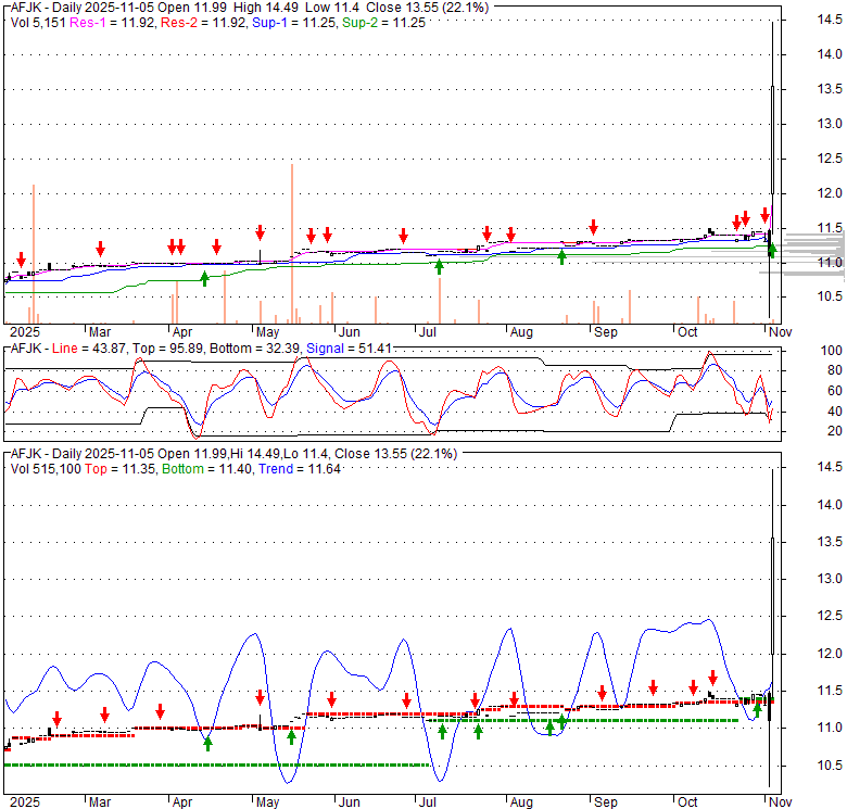 Price has closed above its short-term moving average. Short-term moving average is currently above mid-term; and above long-term moving average. From the relationship between price and moving averages: This stock is BULLISH in short-term; and BULLISH in mid-long term.[ AFJK ] has closed above the upper band by 42.5%. If price is in a uptrend band; this upward trend in price might continue. However a short term pullback inside the band is likely.Bollinger Bands are 1348.6% wider than normal. The large width of the bands suggest high volatility as compared to its normal range. The bands have been in this wide range for 1 days. This is a sign that the current trend might continue.