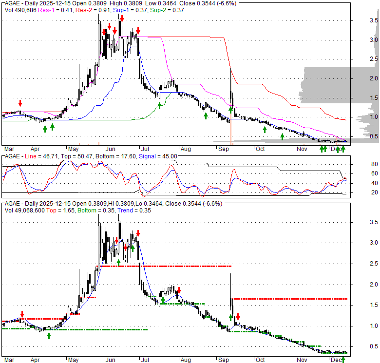 Price has closed below its short-term moving average. Short-term moving average is currently below mid-term; and below long-term moving average. From the relationship between price and moving averages: This stock is BEARISH in short-term; and BEARISH in mid-long term.[ AGAE ] has closed above bottom band by 23.7%. Bollinger Bands are 79.4% narrower than normal. The narrow width of the bands suggests low volatility as compared to its normal range. The bands have been in this narrow range for 52 bars. This is a sign that the market may be about to initiate a new trend.