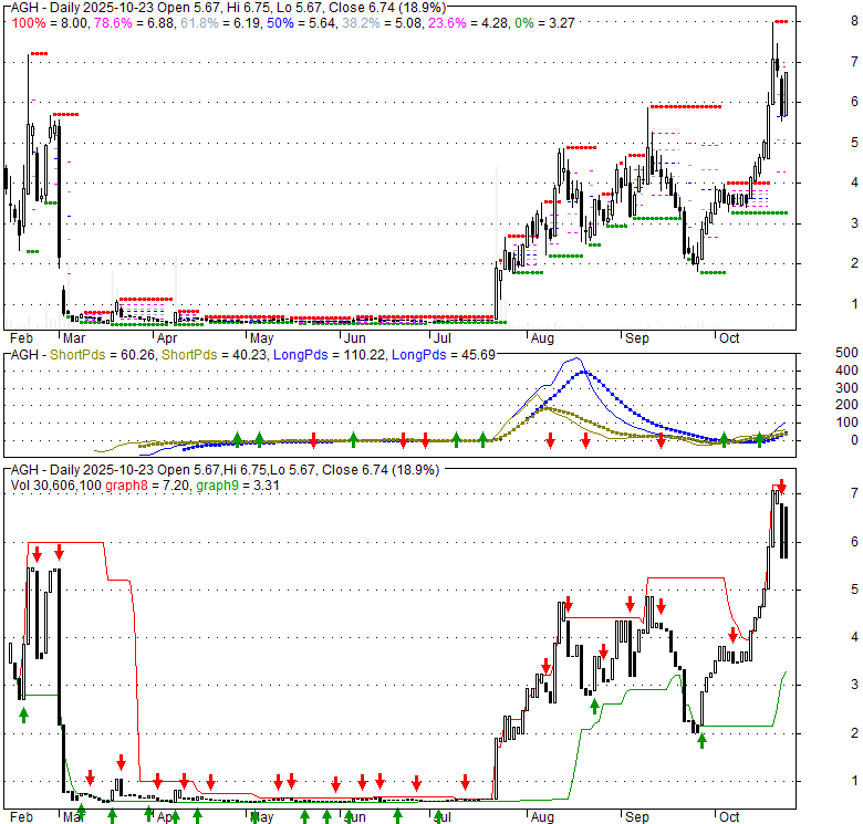 Price has closed above its short-term moving average. Short-term moving average is currently above mid-term; and above long-term moving average. From the relationship between price and moving averages: This stock is BULLISH in short-term; and BULLISH in mid-long term.[ AGH ] has closed below upper band by 9.8%. Bollinger Bands are 190.5% wider than normal. The large width of the bands suggest high volatility as compared to its normal range. The bands have been in this wide range for 5 days. This is a sign that the current trend might continue.
