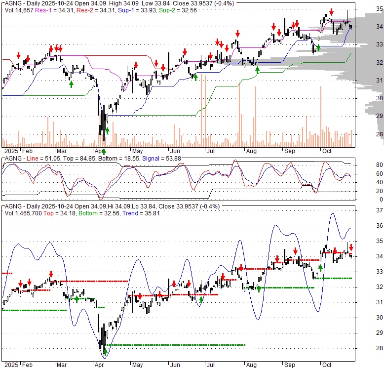 Price has closed below its short-term moving average. Short-term moving average is currently above mid-term; and above long-term moving average. From the relationship between price and moving averages: This stock is NEUTRAL in short-term; and BULLISH in mid-long term.[ AGNG ] has closed above bottom band by 34.4%. Bollinger Bands are 29% narrower than normal. The current width of the bands does not suggest anything about the future direction or movement of prices.