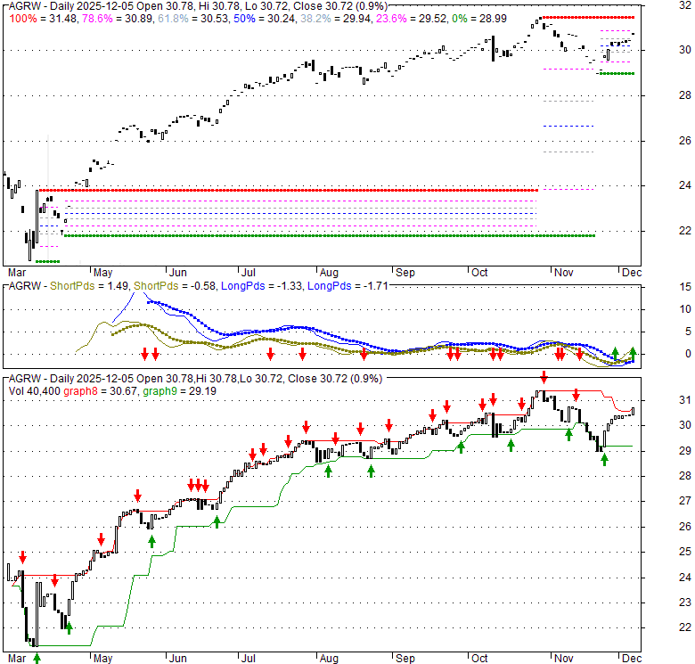 Price has closed above its short-term moving average. Short-term moving average is currently above mid-term; and above long-term moving average. From the relationship between price and moving averages: This stock is BULLISH in short-term; and BULLISH in mid-long term.[ AGRW ] has closed below upper band by 12.5%. Bollinger Bands are 51.7% wider than normal. The large width of the bands suggest high volatility as compared to its normal range. The bands have been in this wide range for 13 days. This is a sign that the current trend might continue.