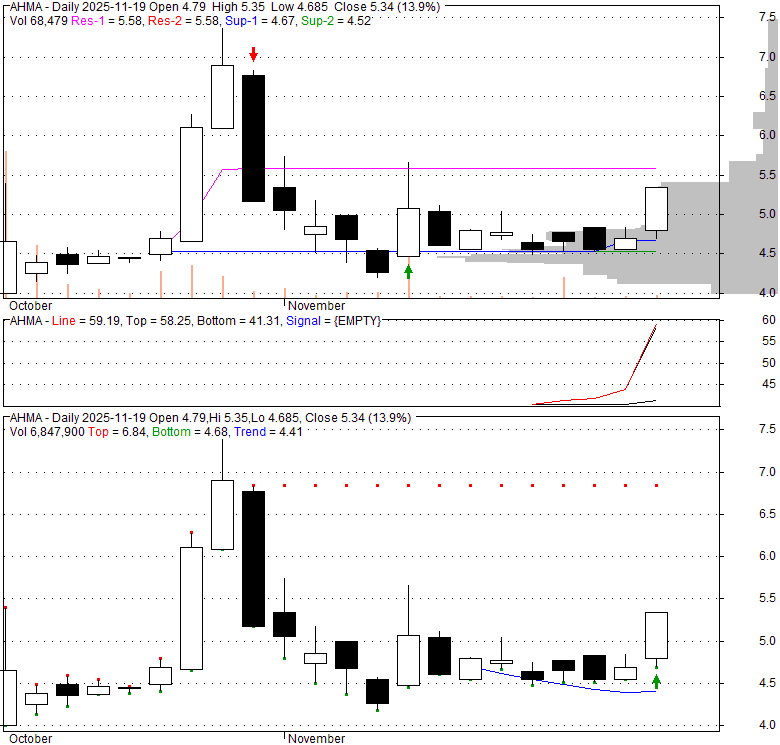 Price has closed above its short-term moving average. Short-term moving average is currently below mid-term; and below long-term moving average. From the relationship between price and moving averages: This stock is NEUTRAL in short-term; and NEUTRAL in mid-long term.[ AHMA ] has closed below upper band by 32.6%. Bollinger Bands are 0% narrower than normal.