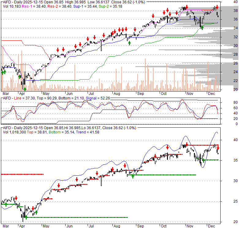 Price has closed below its short-term moving average. Short-term moving average is currently above mid-term; and above long-term moving average. From the relationship between price and moving averages: This stock is NEUTRAL in short-term; and BULLISH in mid-long term.[ AIFD ] has closed above bottom band by 24.0%. Bollinger Bands are 8.9% wider than normal. The current width of the bands does not suggest anything about the future direction or movement of prices.