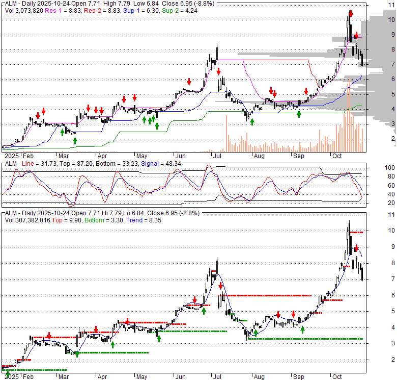 Price has closed below its short-term moving average. Short-term moving average is currently above mid-term; and above long-term moving average. From the relationship between price and moving averages: This stock is NEUTRAL in short-term; and BULLISH in mid-long term.[ ALM ] has closed above bottom band by 18.0%. Bollinger Bands are 56.3% wider than normal. The large width of the bands suggest high volatility as compared to its normal range. The bands have been in this wide range for 12 days. This is a sign that the current trend might continue.