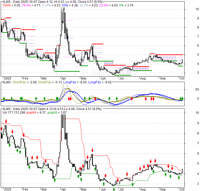 Price has closed above its short-term moving average. Short-term moving average is currently below mid-term; and above long-term moving average. From the relationship between price and moving averages: This stock is NEUTRAL in short-term; and NEUTRAL in mid-long term.[ ALMS ] has closed It is unclear right now based on current values. 51.7% narrower than normal. The narrow width of the bands suggests low volatility as compared to its normal range. The bands have been in this narrow range for 79 bars. This is a sign that the market may be about to initiate a new trend.