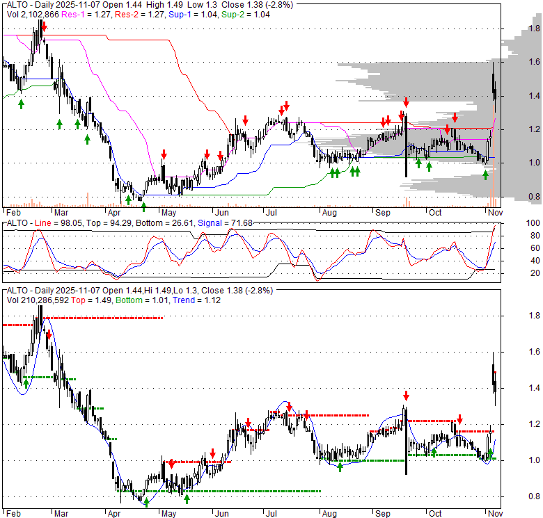 Price has closed above its short-term moving average. Short-term moving average is currently above mid-term; and above long-term moving average. From the relationship between price and moving averages: This stock is BULLISH in short-term; and NEUTRAL in mid-long term.[ ALTO ] has closed below upper band by 2.6%. Bollinger Bands are 108.6% wider than normal. The large width of the bands suggest high volatility as compared to its normal range. The bands have been in this wide range for 1 days. This is a sign that the current trend might continue.
