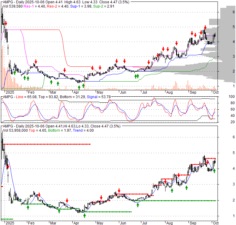 Price has closed above its short-term moving average. Short-term moving average is currently above mid-term; and above long-term moving average. From the relationship between price and moving averages: This stock is BULLISH in short-term; and BULLISH in mid-long term.[ AMPG ] has closed below upper band by 24.9%. Bollinger Bands are 25.8% wider than normal. The current width of the bands does not suggest anything about the future direction or movement of prices.