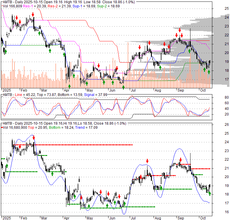 Price has closed above its short-term moving average. Short-term moving average is currently below mid-term; and below long-term moving average. From the relationship between price and moving averages: This stock is NEUTRAL in short-term; and NEUTRAL in mid-long term.[ AMTB ] has closed above bottom band by 39.9%. Bollinger Bands are 14.2% narrower than normal. The current width of the bands does not suggest anything about the future direction or movement of prices.