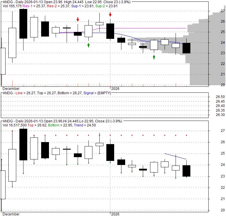Price has closed below its short-term moving average. Short-term moving average is currently below mid-term; and below long-term moving average. From the relationship between price and moving averages: This stock is NEUTRAL in short-term; and NEUTRAL in mid-long term.[ ANDG ] has closed above bottom band by 5.5%. Bollinger Bands are 0% narrower than normal.