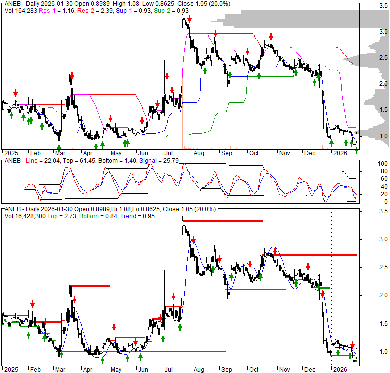 Price has closed above its short-term moving average. Short-term moving average is currently below mid-term; and below long-term moving average. From the relationship between price and moving averages: This stock is NEUTRAL in short-term; and BEARISH in mid-long term.[ ANEB ] has closed below upper band by 49.8%. Bollinger Bands are 42.6% narrower than normal. The narrow width of the bands suggests low volatility as compared to its normal range. The bands have been in this narrow range for 0 bars. This is a sign that the market may be about to initiate a new trend.