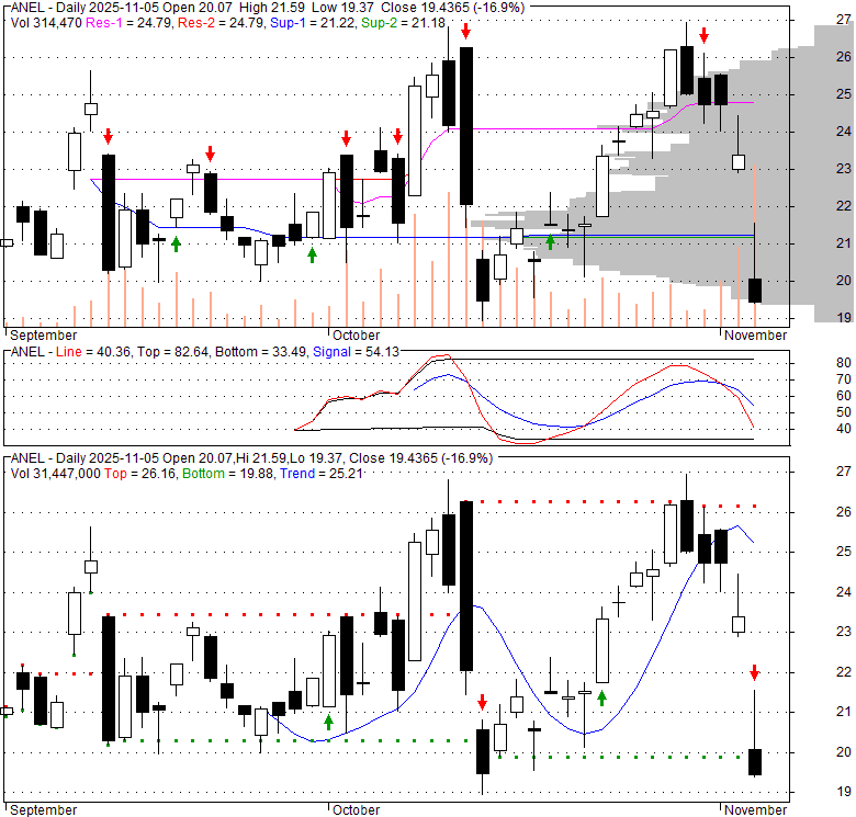 Price has closed below its short-term moving average. Short-term moving average is currently below mid-term; and below long-term moving average. From the relationship between price and moving averages: This stock is NEUTRAL in short-term; and NEUTRAL in mid-long term.[ ANEL ] has closed above bottom band by 2.3%. Bollinger Bands are 0% narrower than normal.