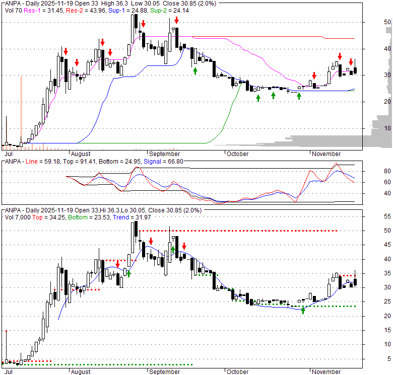 Price has closed above its short-term moving average. Short-term moving average is currently above mid-term; and below long-term moving average. From the relationship between price and moving averages: This stock is BULLISH in short-term; and NEUTRAL in mid-long term.[ ANPA ] has closed below upper band by 35.9%. Bollinger Bands are 0% narrower than normal.