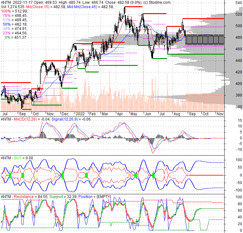 Price has closed below its short-term moving average. Short-term moving average is currently below mid-term; and above long-term moving average. From the relationship between price and moving averages: This stock is NEUTRAL in short-term; and NEUTRAL in mid-long term.[ ANTM ] has closed Bollinger Bands are 100% narrower than normal. The narrow width of the bands suggests low volatility as compared to its normal range. The bands have been in this narrow range for 47 bars. This is a sign that the market may be about to initiate a new trend.