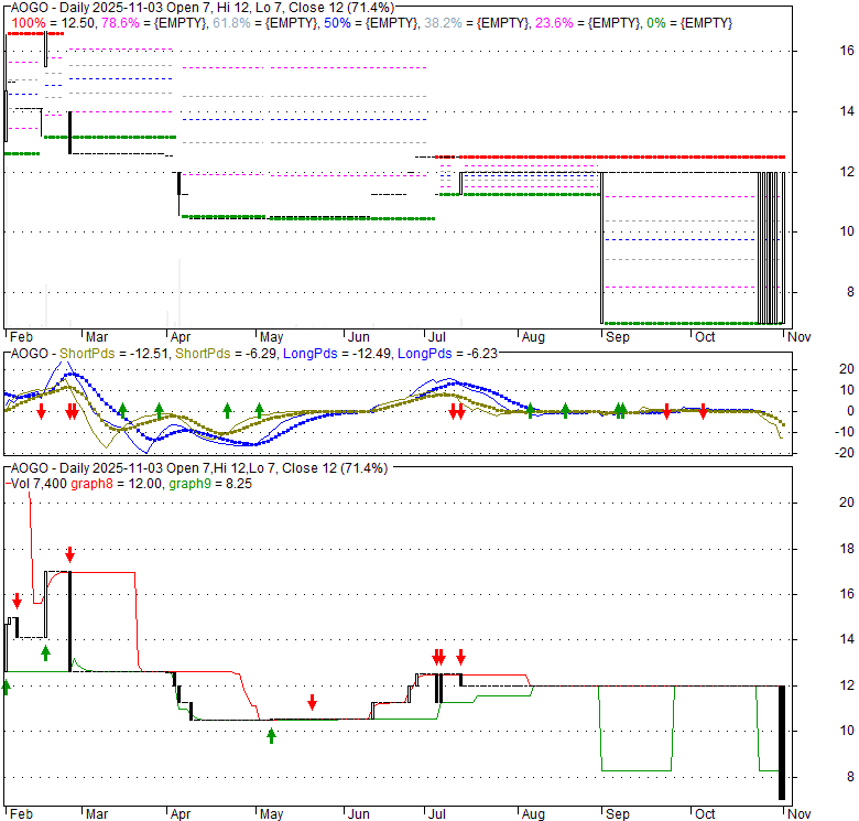 Price has closed above its short-term moving average. Short-term moving average is currently below mid-term; and below long-term moving average. From the relationship between price and moving averages: This stock is NEUTRAL in short-term; and BEARISH in mid-long term.[ AOGO ] has closed below upper band by 43.3%. Bollinger Bands are 690.1% wider than normal. The large width of the bands suggest high volatility as compared to its normal range. The bands have been in this wide range for 1 days. This is a sign that the current trend might continue.