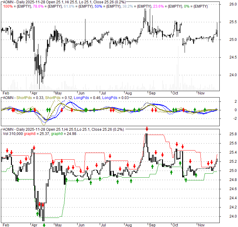 Price has closed above its short-term moving average. Short-term moving average is currently above mid-term; and above long-term moving average. From the relationship between price and moving averages: This stock is BULLISH in short-term; and NEUTRAL in mid-long term.[ AOMN ] has closed It is unclear right now based on current values. 44.1% narrower than normal. The narrow width of the bands suggests low volatility as compared to its normal range. The bands have been in this narrow range for 16 bars. This is a sign that the market may be about to initiate a new trend.