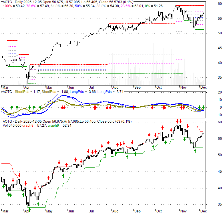 Price has closed above its short-term moving average. Short-term moving average is currently above mid-term; and above long-term moving average. From the relationship between price and moving averages: This stock is BULLISH in short-term; and BULLISH in mid-long term.[ AOTG ] has closed above bottom band by 38.7%. Bollinger Bands are 39.6% wider than normal. The current width of the bands does not suggest anything about the future direction or movement of prices.