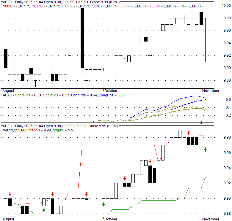 Price has closed above its short-term moving average. Short-term moving average is currently above mid-term; and below long-term moving average. From the relationship between price and moving averages: This stock is BULLISH in short-term; and NEUTRAL in mid-long term.[ APAD ] has closed below upper band by 19.9%. Bollinger Bands are 0% narrower than normal.