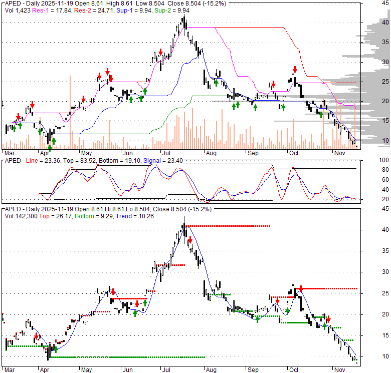 Price has closed below its short-term moving average. Short-term moving average is currently below mid-term; and below long-term moving average. From the relationship between price and moving averages: This stock is BEARISH in short-term; and BEARISH in mid-long term.[ APED ] has closed above bottom band by 7.7%. Bollinger Bands are 1.2% wider than normal. The current width of the bands does not suggest anything about the future direction or movement of prices.