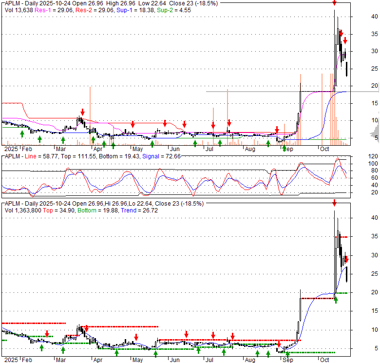 Price has closed below its short-term moving average. Short-term moving average is currently above mid-term; and above long-term moving average. From the relationship between price and moving averages: This stock is NEUTRAL in short-term; and BULLISH in mid-long term.[ APLM ] has closed above bottom band by 47.4%. Bollinger Bands are 336.9% wider than normal. The large width of the bands suggest high volatility as compared to its normal range. The bands have been in this wide range for 6 days. This is a sign that the current trend might continue.