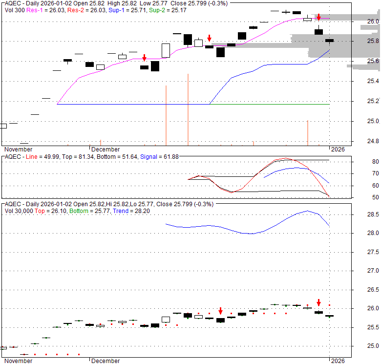 Price has closed below its short-term moving average. Short-term moving average is currently below mid-term; and below long-term moving average. From the relationship between price and moving averages: This stock is NEUTRAL in short-term; and NEUTRAL in mid-long term.[ AQEC ] has closed above bottom band by 34.1%. Bollinger Bands are 0% narrower than normal.