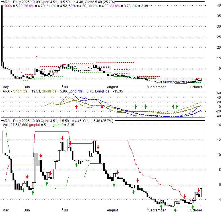 Price has closed above its short-term moving average. Short-term moving average is currently below mid-term; and below long-term moving average. From the relationship between price and moving averages: This stock is NEUTRAL in short-term; and BEARISH in mid-long term.[ ARAI ] has closed Bollinger Bands are 0% narrower than normal.