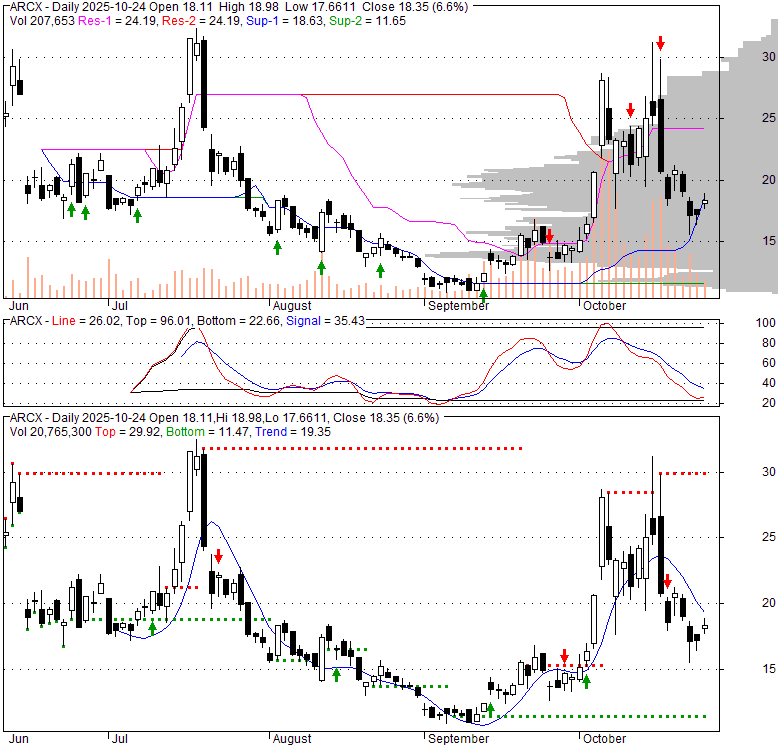 Price has closed below its short-term moving average. Short-term moving average is currently above mid-term; and below long-term moving average. From the relationship between price and moving averages: This stock is NEUTRAL in short-term; and NEUTRAL in mid-long term.[ ARCX ] has closed above bottom band by 23.4%. Bollinger Bands are 0% narrower than normal.