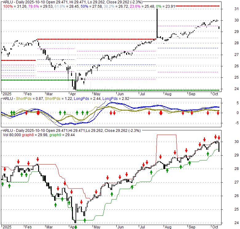 Price has closed below its short-term moving average. Short-term moving average is currently above mid-term; and above long-term moving average. From the relationship between price and moving averages: This stock is NEUTRAL in short-term; and BULLISH in mid-long term.[ ARLU ] has closed below the lower bollinger band by 7.3%. Although price has broken the lower band and a downside breakout is possible; the most likely direction for [ ARLU ] is to continue within current trading range. Bollinger Bands are 0.5% narrower than normal. The current width of the bands does not suggest anything about the future direction or movement of prices.