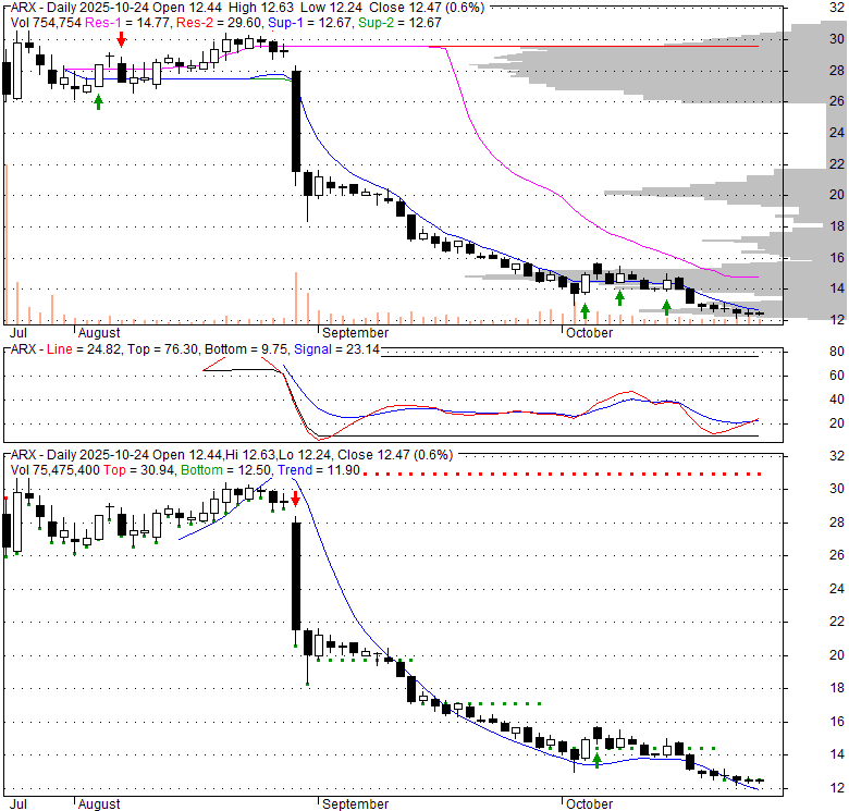 Price has closed below its short-term moving average. Short-term moving average is currently below mid-term; and below long-term moving average. From the relationship between price and moving averages: This stock is BEARISH in short-term; and NEUTRAL in mid-long term.[ ARX ] has closed above bottom band by 12.3%. Bollinger Bands are 0% narrower than normal.