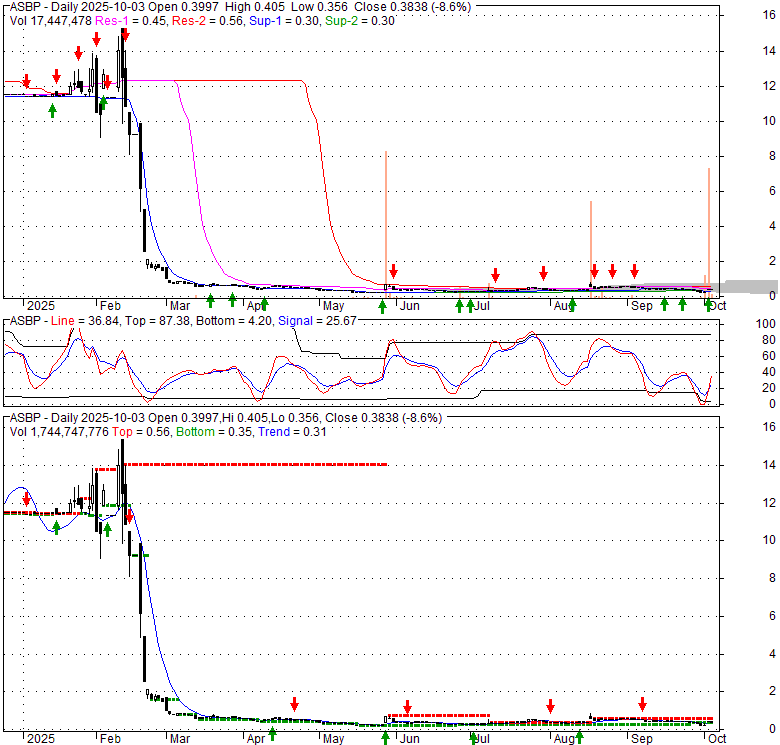 Price has closed above its short-term moving average. Short-term moving average is currently below mid-term; and below long-term moving average. From the relationship between price and moving averages: This stock is NEUTRAL in short-term; and NEUTRAL in mid-long term.[ ASBP ] has closed below upper band by 48.6%. Bollinger Bands are 12.7% wider than normal. The current width of the bands does not suggest anything about the future direction or movement of prices.