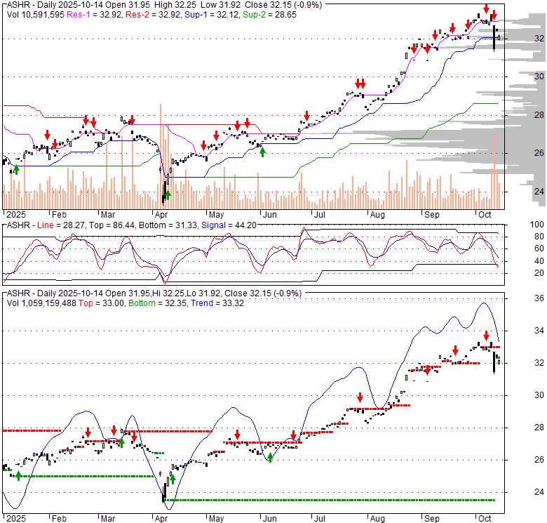 Price has closed above its short-term moving average. Short-term moving average is currently above mid-term; and above long-term moving average. From the relationship between price and moving averages: This stock is BULLISH in short-term; and BULLISH in mid-long term.[ ASHR ] has closed above bottom band by 41.4%. Bollinger Bands are 4.2% wider than normal. The current width of the bands does not suggest anything about the future direction or movement of prices.