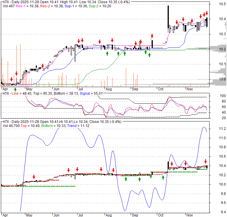 Price has closed below its short-term moving average. Short-term moving average is currently above mid-term; and above long-term moving average. From the relationship between price and moving averages: This stock is NEUTRAL in short-term; and BULLISH in mid-long term.[ ATII ] has closed above bottom band by 13.7%. Bollinger Bands are 17.6% narrower than normal. The current width of the bands does not suggest anything about the future direction or movement of prices.