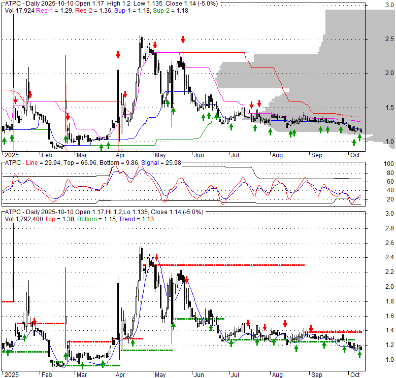 Price has closed below its short-term moving average. Short-term moving average is currently below mid-term; and below long-term moving average. From the relationship between price and moving averages: This stock is BEARISH in short-term; and BEARISH in mid-long term.[ ATPC ] has closed above bottom band by 8.1%. Bollinger Bands are 43.6% narrower than normal. The narrow width of the bands suggests low volatility as compared to its normal range. The bands have been in this narrow range for 67 bars. This is a sign that the market may be about to initiate a new trend.