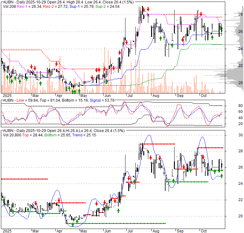 Price has closed below its short-term moving average. Short-term moving average is currently below mid-term; and above long-term moving average. From the relationship between price and moving averages: This stock is BEARISH in short-term; and NEUTRAL in mid-long term.[ AUBN ] has closed above bottom band by 45.2%. Bollinger Bands are 49.8% narrower than normal. The narrow width of the bands suggests low volatility as compared to its normal range. The bands have been in this narrow range for 4 bars. This is a sign that the market may be about to initiate a new trend.