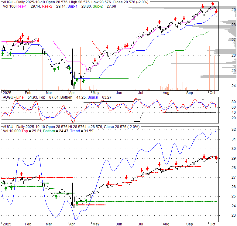 Price has closed below its short-term moving average. Short-term moving average is currently above mid-term; and above long-term moving average. From the relationship between price and moving averages: This stock is NEUTRAL in short-term; and BULLISH in mid-long term.[ AUGU ] has closed below the lower bollinger band by 4.0%. Although price has broken the lower band and a downside breakout is possible; the most likely direction for [ AUGU ] is to continue within current trading range. Bollinger Bands are 7.5% narrower than normal. The current width of the bands does not suggest anything about the future direction or movement of prices.