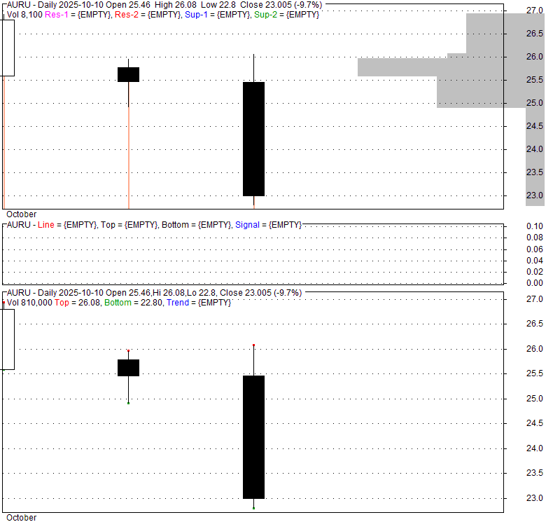 Price has closed below its short-term moving average. Short-term moving average is currently below mid-term; and below long-term moving average. From the relationship between price and moving averages: This stock is NEUTRAL in short-term; and NEUTRAL in mid-long term.[ AURU ] has closed Bollinger Bands are 0% narrower than normal.