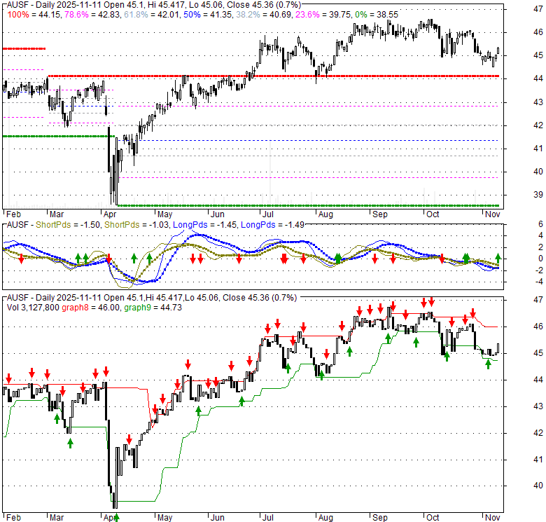 Price has closed above its short-term moving average. Short-term moving average is currently below mid-term; and below long-term moving average. From the relationship between price and moving averages: This stock is NEUTRAL in short-term; and NEUTRAL in mid-long term.[ AUSF ] has closed above bottom band by 49.6%. Bollinger Bands are 6.3% wider than normal. The current width of the bands does not suggest anything about the future direction or movement of prices.