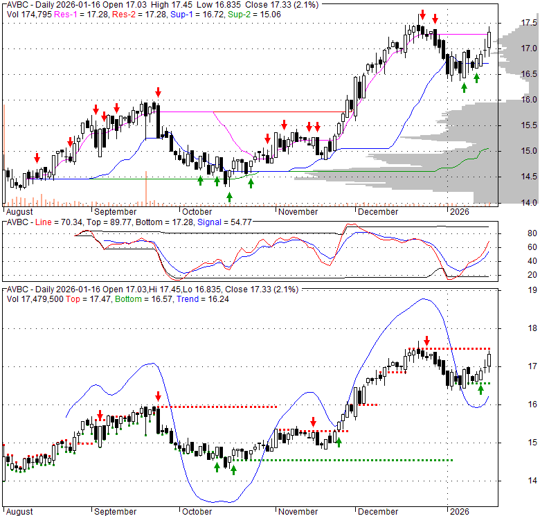 Price has closed above its short-term moving average. Short-term moving average is currently above mid-term; and above long-term moving average. From the relationship between price and moving averages: This stock is BULLISH in short-term; and BULLISH in mid-long term.[ AVBC ] has closed below upper band by 3.3%. Bollinger Bands are 16.8% narrower than normal. The current width of the bands does not suggest anything about the future direction or movement of prices.