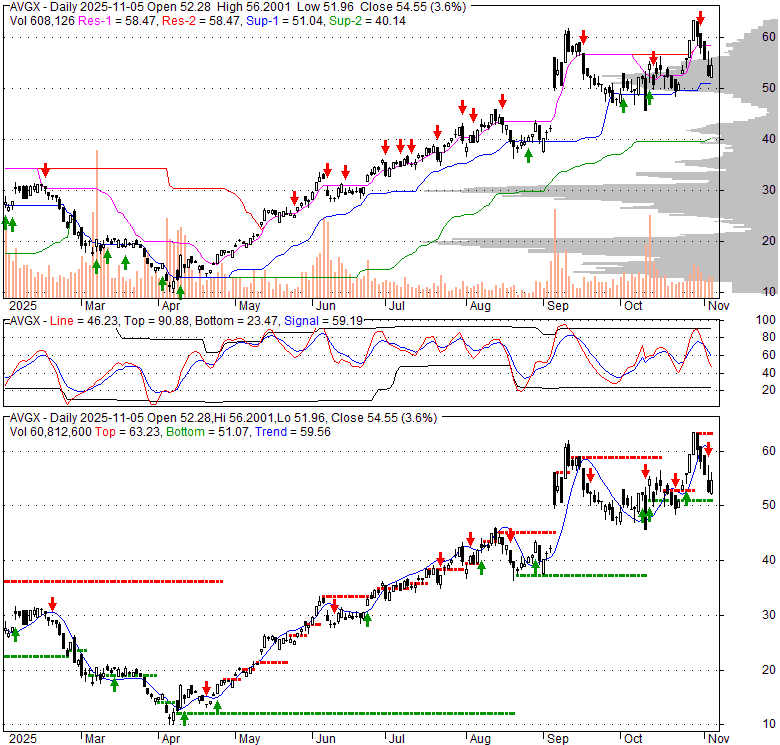 Price has closed below its short-term moving average. Short-term moving average is currently above mid-term; and above long-term moving average. From the relationship between price and moving averages: This stock is NEUTRAL in short-term; and BULLISH in mid-long term.[ AVGX ] has closed above bottom band by 48.0%. Bollinger Bands are 41.8% wider than normal. The large width of the bands suggest high volatility as compared to its normal range. The bands have been in this wide range for 5 days. This is a sign that the current trend might continue.