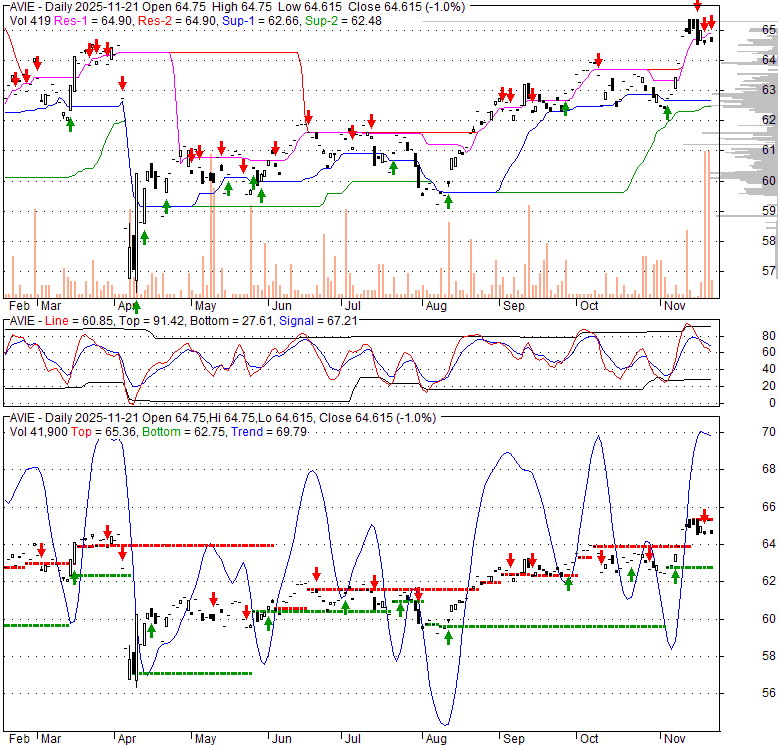Price has closed below its short-term moving average. Short-term moving average is currently above mid-term; and above long-term moving average. From the relationship between price and moving averages: This stock is NEUTRAL in short-term; and BULLISH in mid-long term.[ AVIE ] has closed below upper band by 37.3%. Bollinger Bands are 89.7% wider than normal. The large width of the bands suggest high volatility as compared to its normal range. The bands have been in this wide range for 7 days. This is a sign that the current trend might continue.