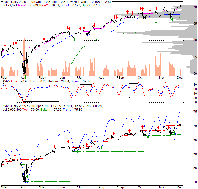 Price has closed above its short-term moving average. Short-term moving average is currently above mid-term; and above long-term moving average. From the relationship between price and moving averages: This stock is BULLISH in short-term; and BULLISH in mid-long term.[ AVIV ] has closed below upper band by 18.3%. Bollinger Bands are 70.4% wider than normal. The large width of the bands suggest high volatility as compared to its normal range. The bands have been in this wide range for 10 days. This is a sign that the current trend might continue.